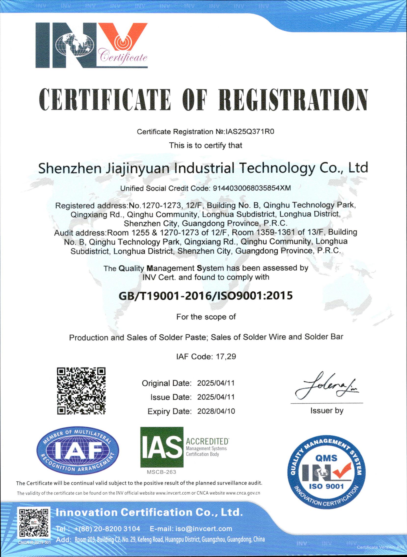 ISO9001佳金源認證證書